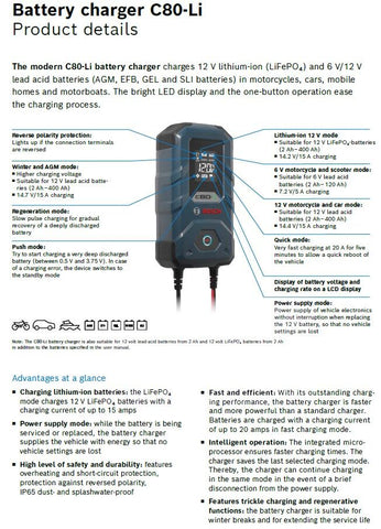 - Suits 6V/12V lead acid & 12V lithium- ion (LiFePO₄) batteries